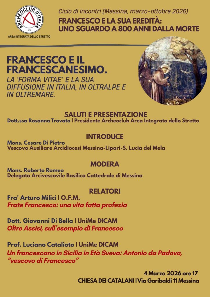 Nell’Ottocentenario del Beato Transito di Francesco d’Assisi, Archeoclub “Area Integrata dello Stretto” offre al pubblico un ciclo di conferenze per celebrare la straordinaria figura del Santo: appassionato del Vangelo, ardente d’amore per il Creato e le sue creature, da ricco si fece povero, da superbo si fece umile, da grande si fece piccolo, consumandosi nella imitazione di “Cristo povero e crocifisso” e sublimandosi nel serafico ardore. Nel ciclo di Archeoclub si ricorderà Francesco ‘riparatore’ della Chiesa, Francesco Padre dei Minori, delle Povere Dame, del Terz’Ordine laico, Francesco ‘ecologista’, Francesco poeta e ispiratore di poeti, e altro ancora. Non mancherà l’attenzione alle interazioni ecclesiali e sociali dell’eredità dei Minori, né potrebbe mancare attenzione agli aspetti materiali di questa eredità, nell’intento di fornire un contributo di valore alla illustrazione di edifici monumentali, significativi della storia del francescanesimo e della storia del territorio messinese. Il programma, onorato dai prestigiosi patrocini (e dal supporto logistico) della Curia Arcivescovile, della Soprintendenza ai BB CC AA, della Città Metropolitana, dell’Autorità del Sistema Portuale dello Stretto, si svilupperà in 7 tappe, concludendosi in Ottobre con un concerto d’organo in Cattedrale , con le relazioni disponibilità di un folto e qualificato gruppo di relatori.