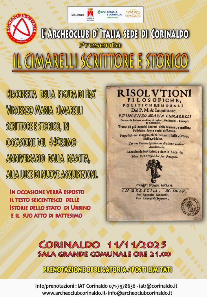 Come noto si ricorda che la prenotazione è obbligatoria e va comunicata all’ufficio IAT Corinaldo 071 -7978636, considerato che l’incontro avrà luogo presso la Sala Grande del Palazzo Comunale, che può ospitare un massimo di cinquantasei persone.
