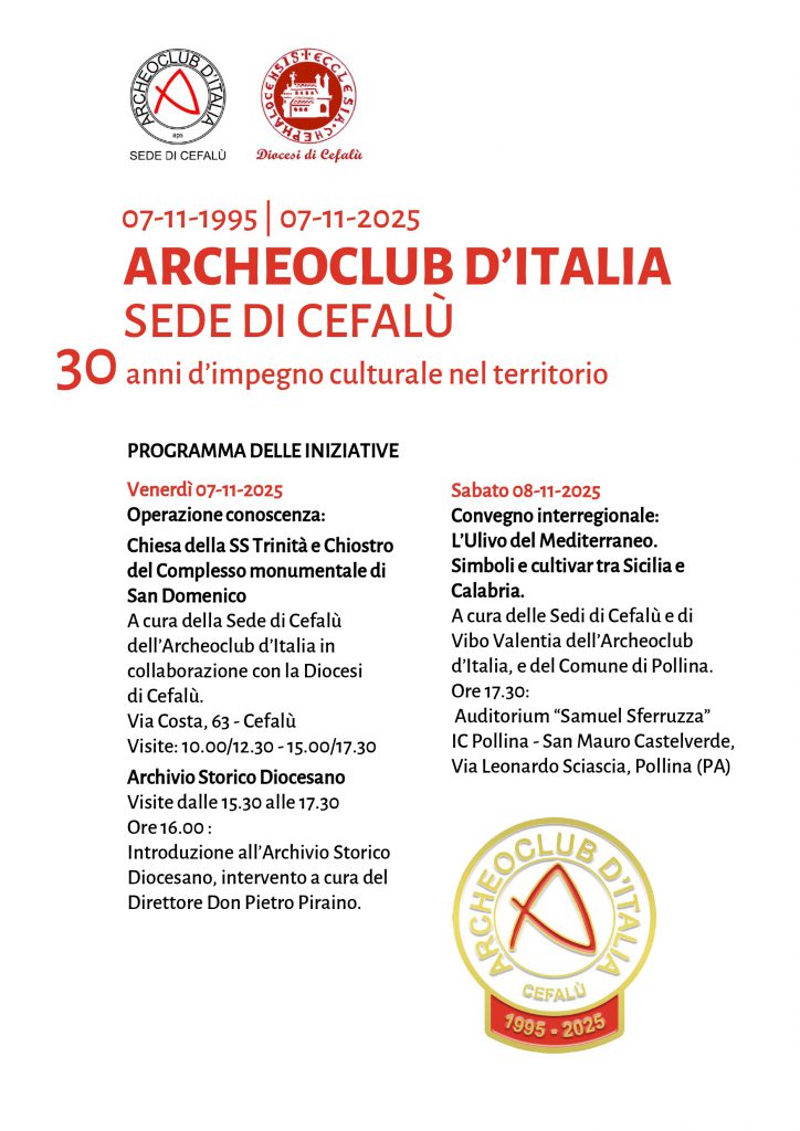 Le attività programmate per questa ricorrenza, articolate in due giornate, tra Cefalù e Finale di Pollina, prevedono per venerdì 7 novembre l’iniziativa “Operazione conoscenza” dedicata alla Chiesa della SS. Trinità e al Chiostro del Complesso monumentale di San Domenico di Cefalù, con un intervento di introduzione all’Archivio Storico Diocesano da parte del Direttore Don Pietro Piraino. Sabato 8 novembre è in programma il convegno interregionale “L’Ulivo del Mediterraneo. Simboli e cultivar tra Sicilia e Calabria” che si terrà a Finale di Pollina, organizzato in collaborazione con la sede Archeoclub d’Italia di Vibo Valentia e il Comune di Pollina.